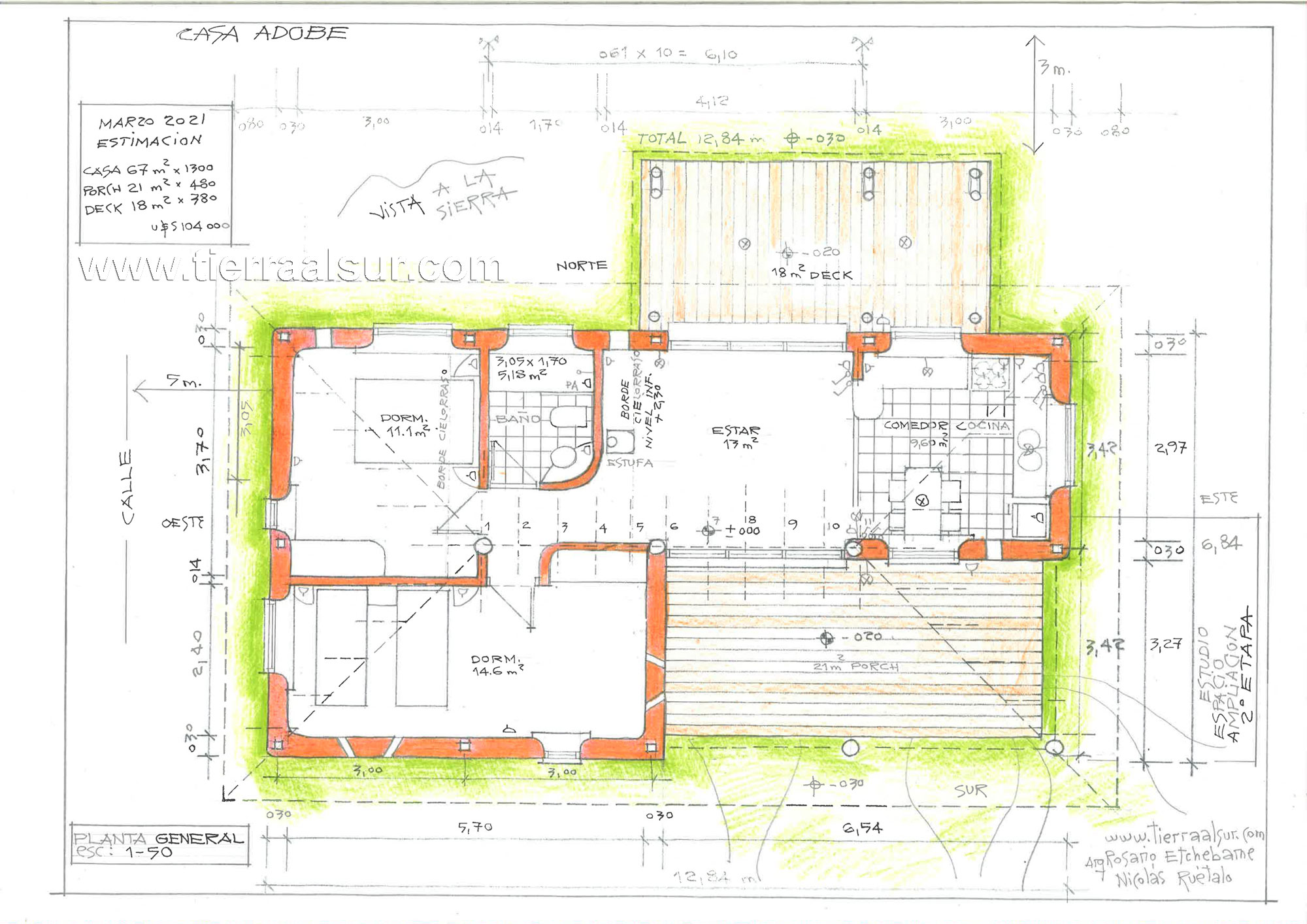 1 - CASA SANA, DISEÑO BIOCLIMÁTICO. En Tierra al sur observamos: el espacio, el terreno, los vecinos, las alturas y desniveles, el norte y el sur, los vientos y el sol. Observamos la vegetación. En esta casa se conservan los árboles y arbustos nativos. La casa se abre al norte, al este y al oeste y se protege al sur.
